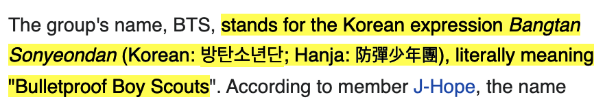 예를 들어, 다음은 BTS 위키피디어 URL에 “most tweeted-about celebrities”를 텍스트 부분식별자로 추가한 것이다. 링크를 클릭하면 웹브라우저는 해당 부분으로 스크롤하고 매칭되는문자열을 강조하여 보여줄 것이다.