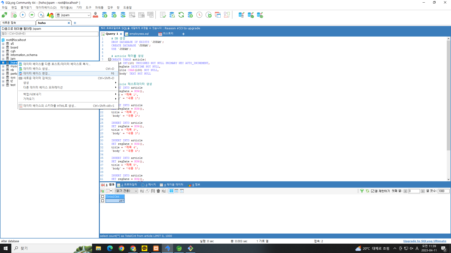 - 내 DB(실습에서는 board라고 만듦) 우클릭 -> 데이터베이스 변경 선택 -> 아래와 같이 수정